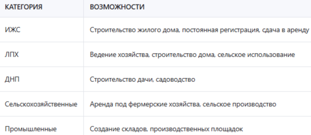 Чтобы лучше понять, какой участок выбрать, рассмотрим таблицу сравнения наиболее популярных категорий земель:
