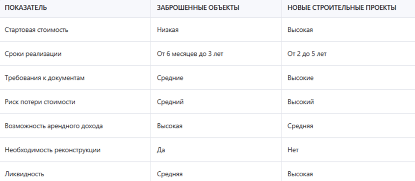 Как видно из таблицы, заброшенные объекты требуют больше усилий на начальном этапе, но при этом могут принести более высокую маржу. Например, инвестор купил старое здание за 15 млн рублей, потратил 10 млн на реконструкцию и продал его за 40 млн — чистая прибыль составила 15 млн рублей.