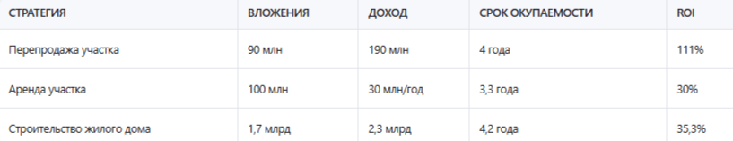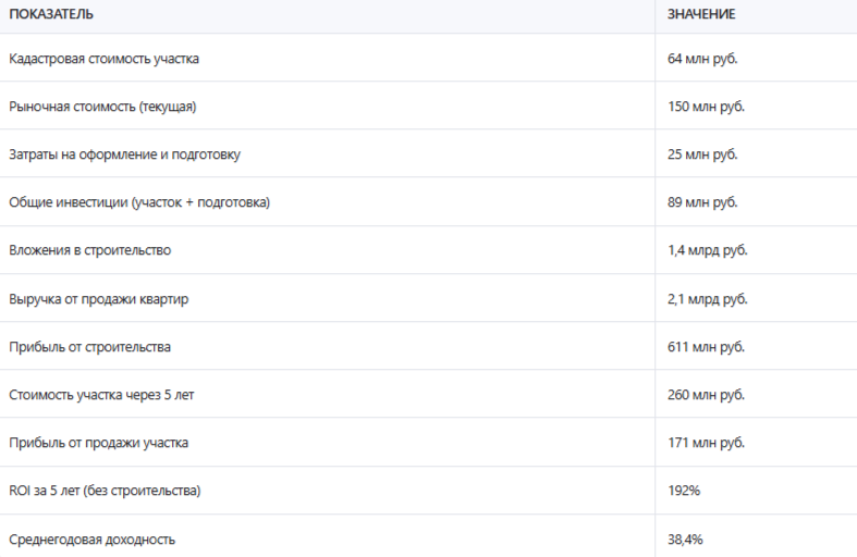 Через 5 лет стоимость участка вырастет до 260 млн рублей. Если не строить, а просто продать — прибыль 171 млн рублей. ROI — 192%. Среднегодовая доходность — 38,4%.