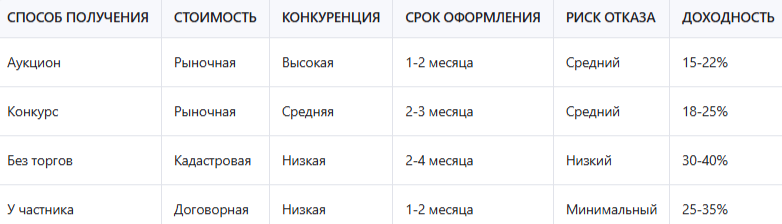 Таблица: сравнение различных способов получения земельного участка
