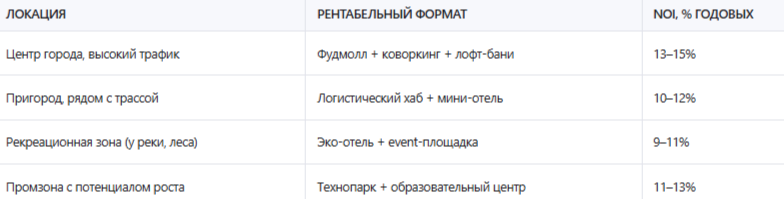 ✔️ Самый быстрый запуск — коворкинг + фуд-корт. Окупается за 3–4 года при грамотной локации. Самый высокий ROI — mixed-use: комбинация офисов, хостела и event-пространства.