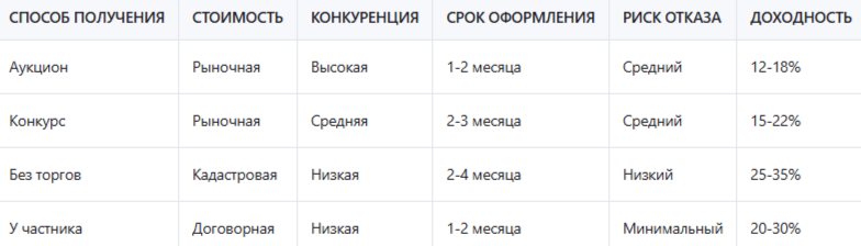 Как видно из таблицы, покупка участка без торгов — это не только более доступный способ входа в рынок, но и самый выгодный с точки зрения доходности и минимальных начальных затрат.